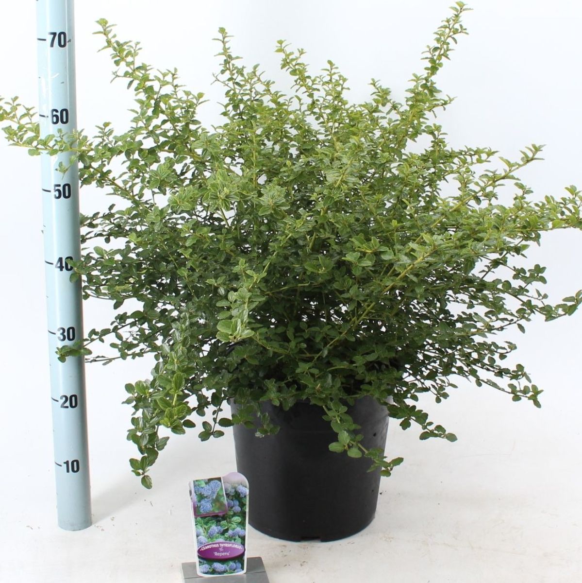 Lav busk, der breder sig. Højde cirka 0,5 m. Stedsegrøn. Skinnende grønne blade. Talrige pastelblå blomster i store toppe. Forår. Solrigt voksested. Følsom over for frost, skal plantes på et beskyttet voksested.