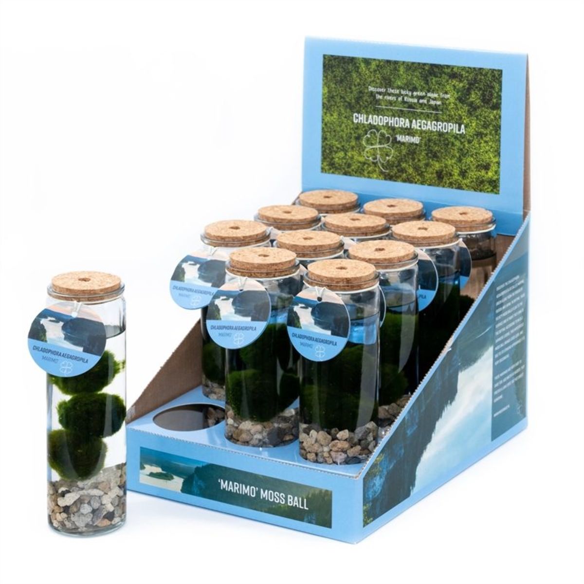 Hver bund i en damvase er fyldt med et lag af damsubstrat for at holde vandkvaliteten optimalt vand Chladophora Aegagropila, også kaldet marimo, kommer fra floderne i Rusland og Japan. Ifølge en gammel japansk legende bringer det held og lykke.