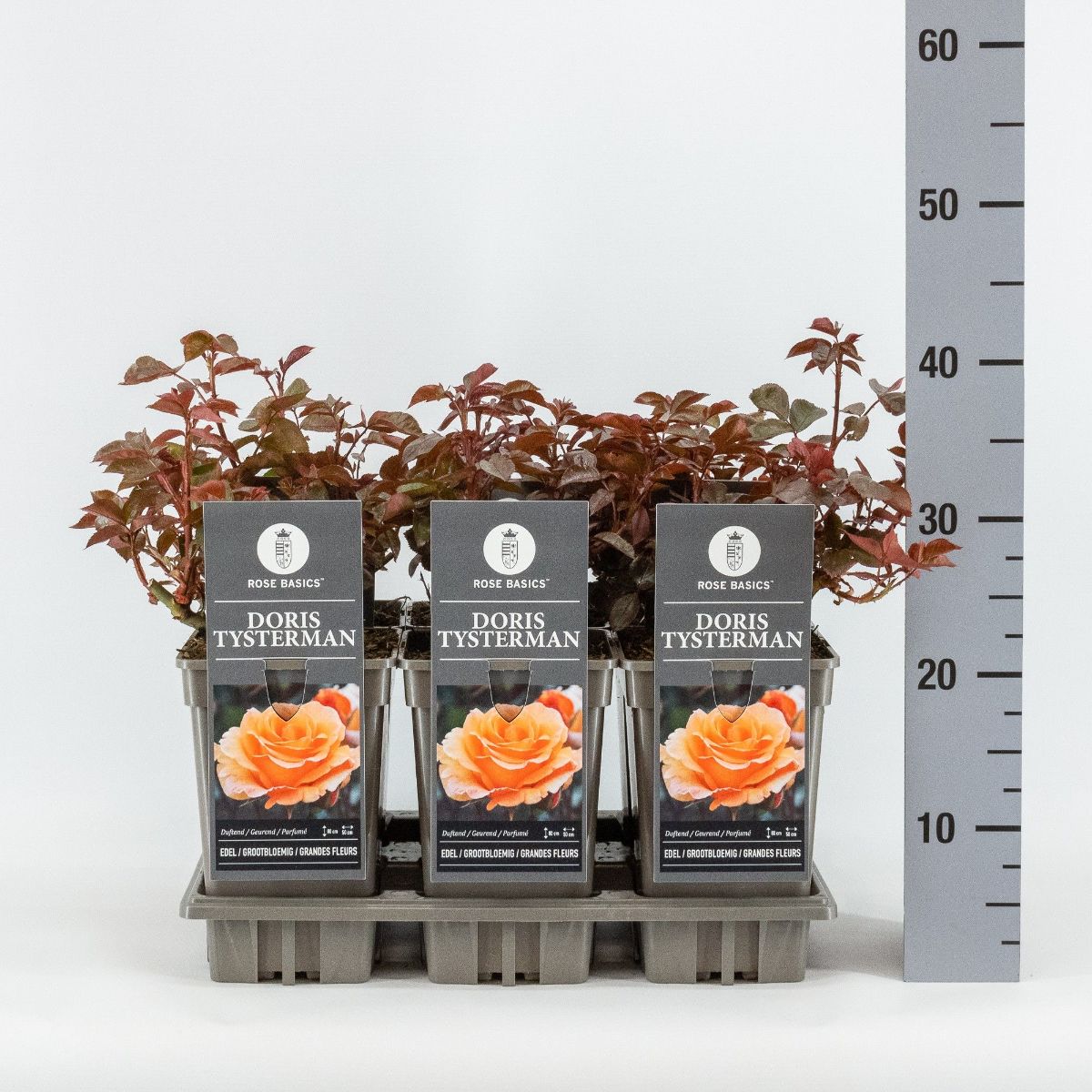 Rigt- og længeblomstrende rose. Store, fyldte kobber-orange blomster på robuste stængler. Hovedblomstring juni - juli. Beskæring efter hovedblomstringen giver efterblomstring til ind i oktober. Solrigt voksested. Højde cirka 90 cm.