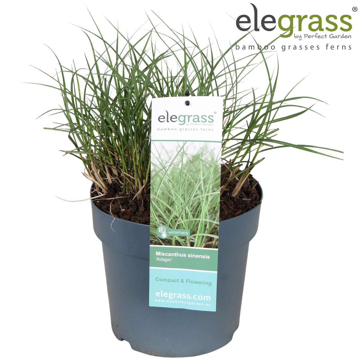 Miscanthus sinensis 'Adagio' er en kompakt prydgræs med fine, buede blade og luftige, sølvfarvede blomsterstande. Perfekt til små haver og som kantplante. Blomstrer fra sensommer til efterår og tilføjer elegance og bevægelse til landskabet.