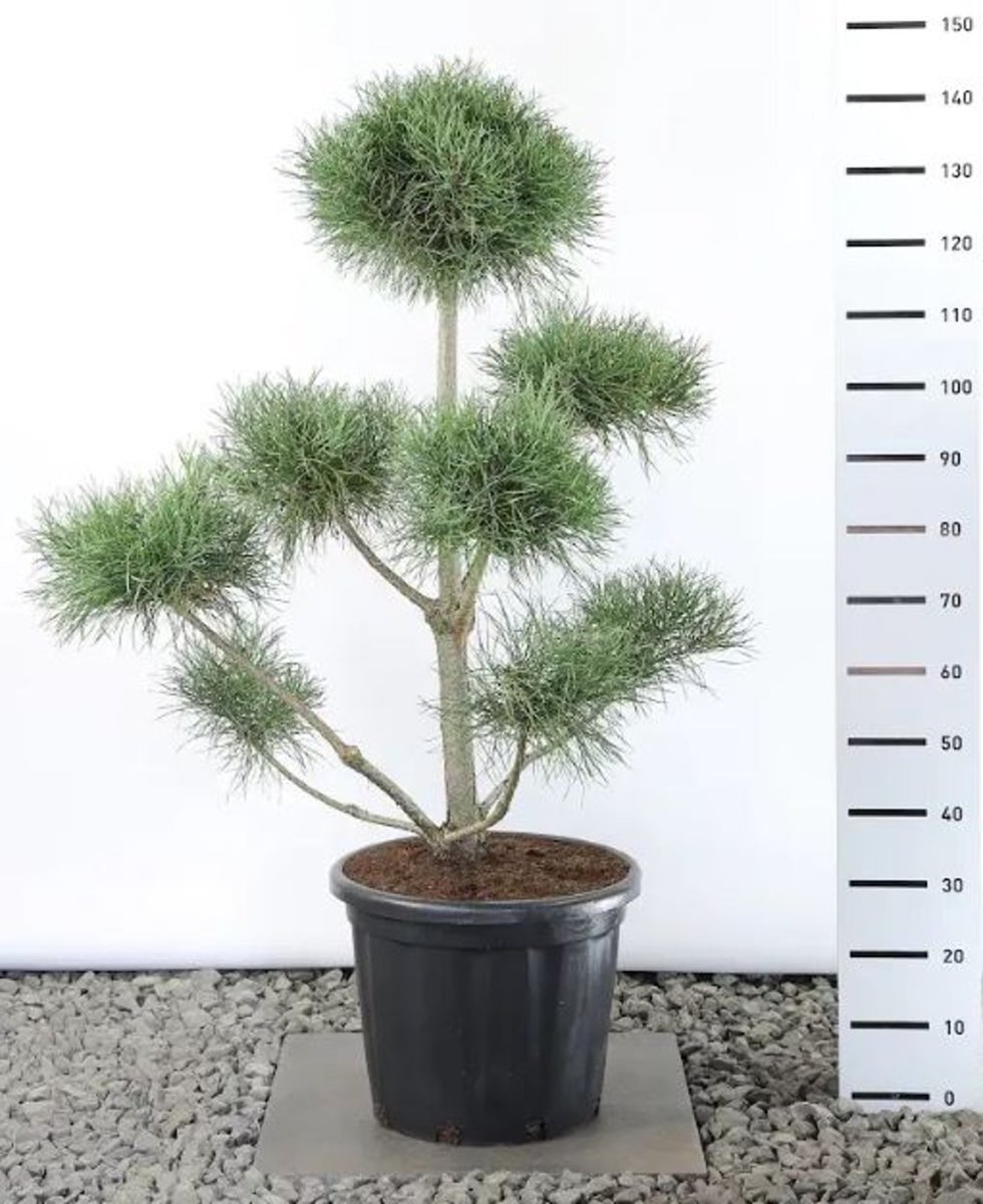 Godt opadvoksende conifer. Først pyramideformet, senere med en mere eller mindre parasolformet og åben krone. Højde cirka 10 m. Nålene lange og mørkegrønne, lidt snoede. Hængende kogler. Egnet til tør jordbund.