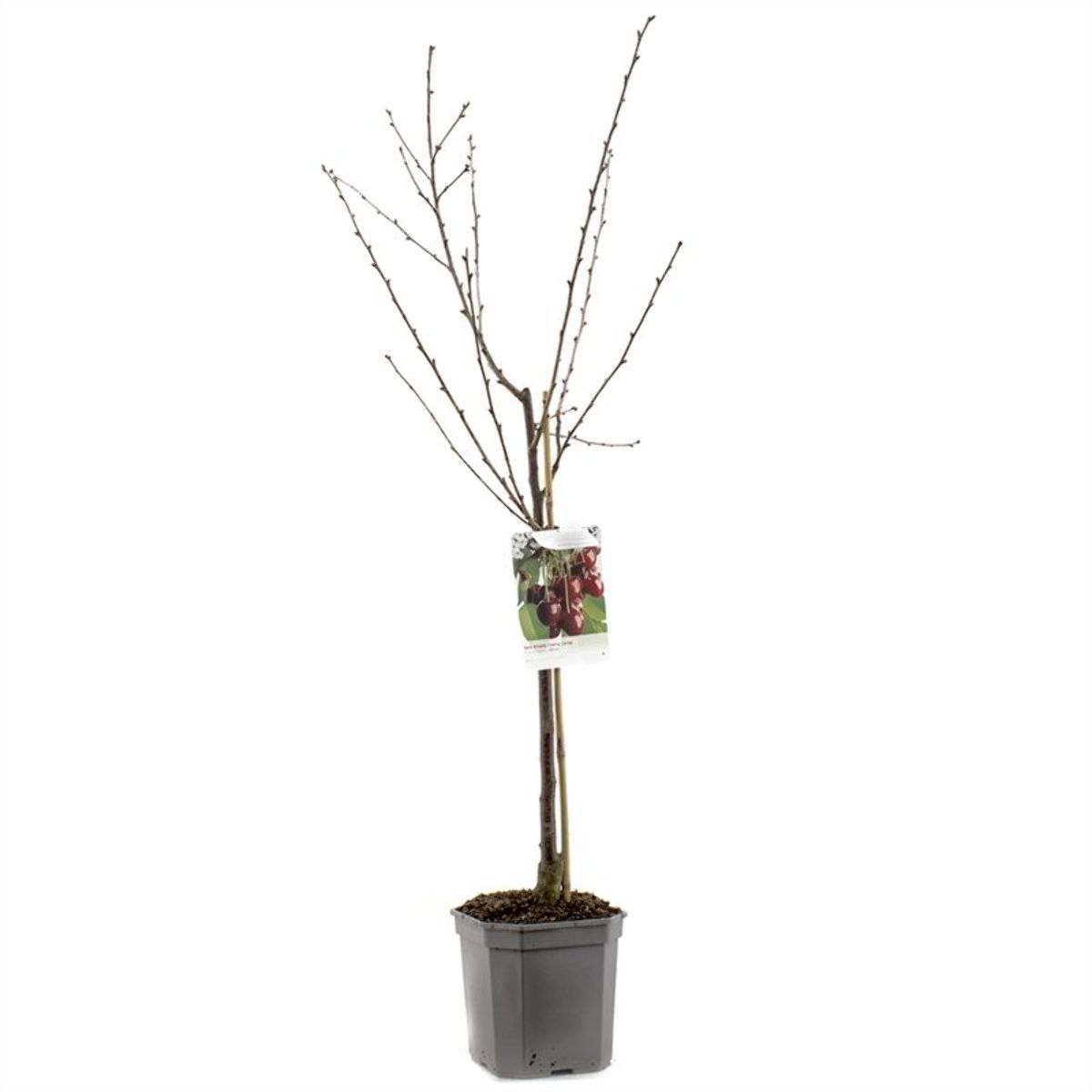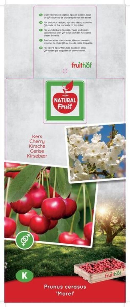 Lille træ op til cirka 6 m højt. Podes også på halvstamme eller lavstamme. Hvid-rosa blomster i maj. Store bløde og sure kirsebær. Mørkerøde. Rigtbærende. Plukketid juni - august. Selvbestøvende.